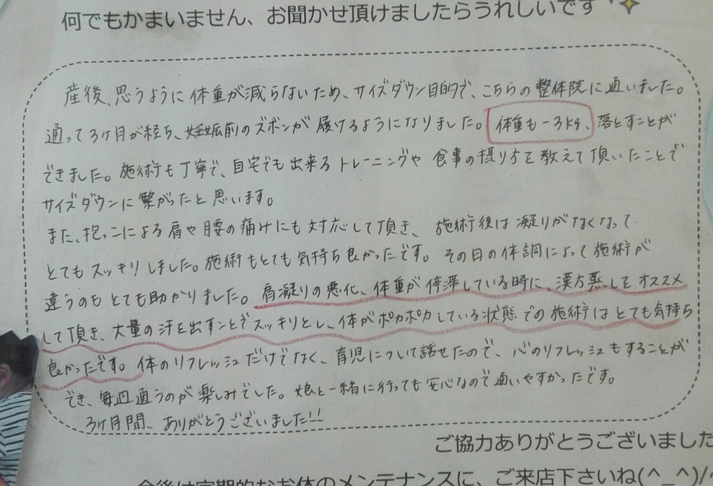 通って3カ月が経ち、妊娠前のズボンが履けるようになりました。体重も-3㌔落とすことができました。