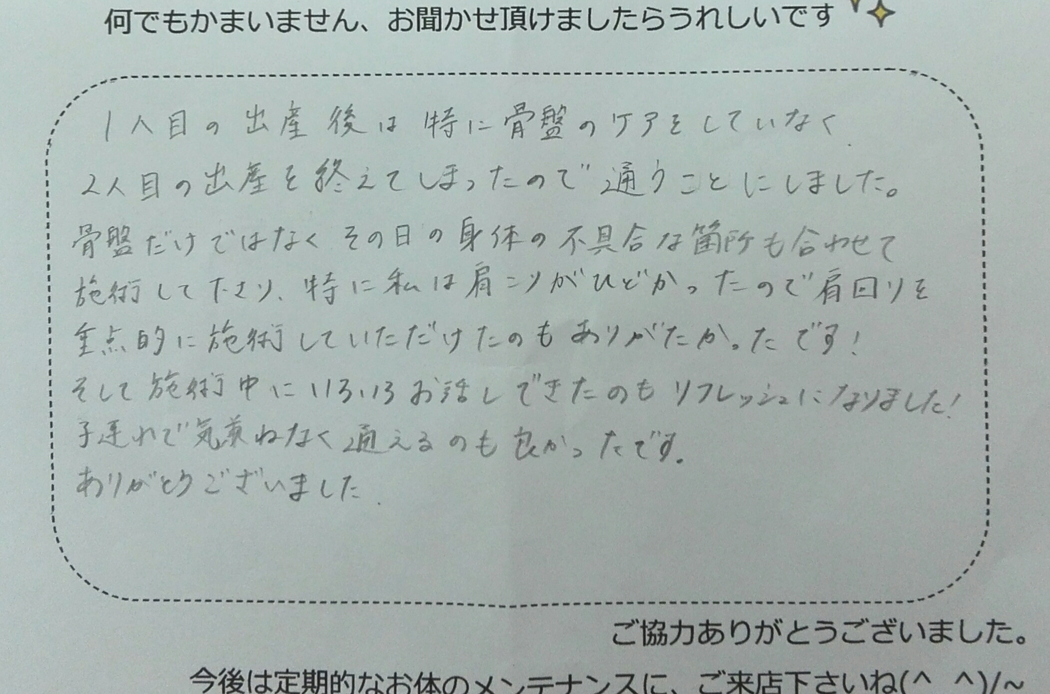 骨盤だけではなく、その日の身体の不具合な箇所も併せて施術してくださり、特に私は肩コリがひどかったので、肩回りを重点的に施術していただけたのも、ありがたかったです!