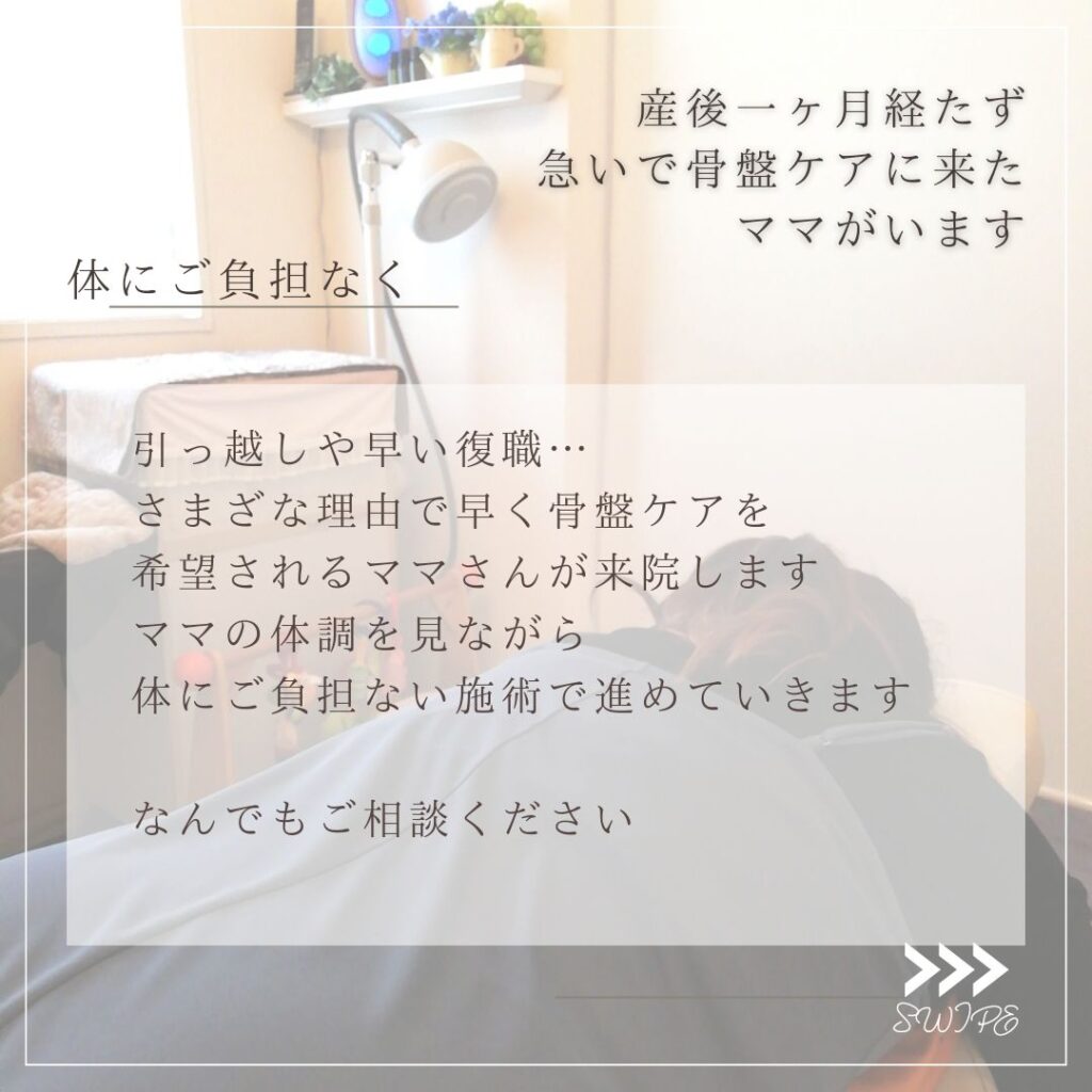 出産のために伸びた靭帯が落ち着いてくる産後1.5ヶ月以降に骨盤ケアを始めるのがおすすめです