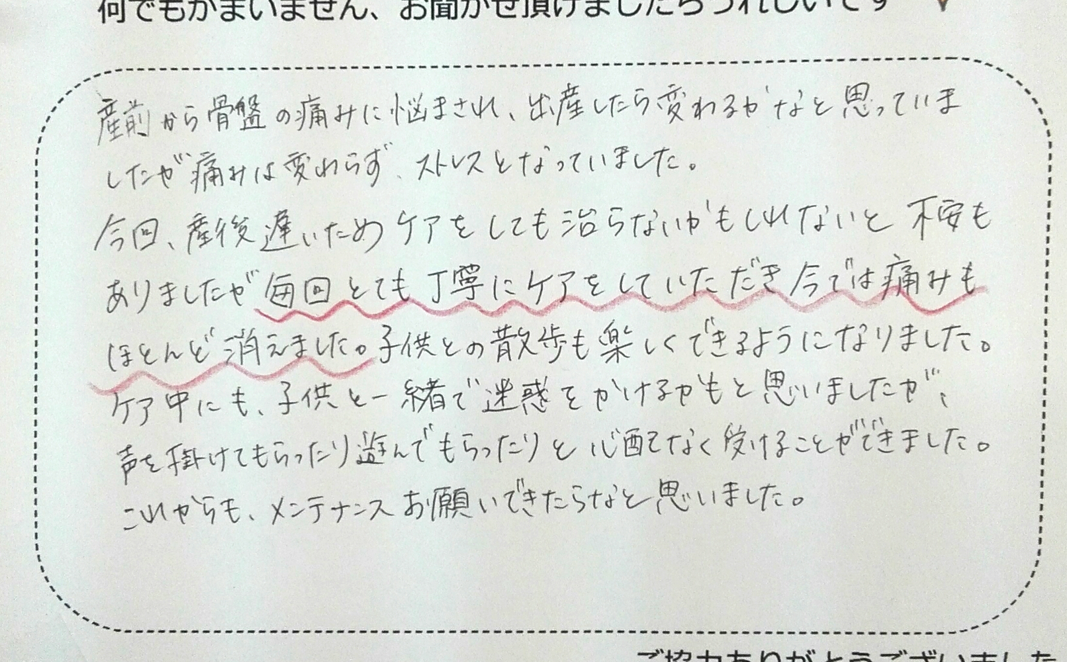 今回、産後遅いためケアをしても治らないかもしれないと不安もありましたが、毎回とても丁寧にケアしていただき、今では痛みもほとんど消えました。