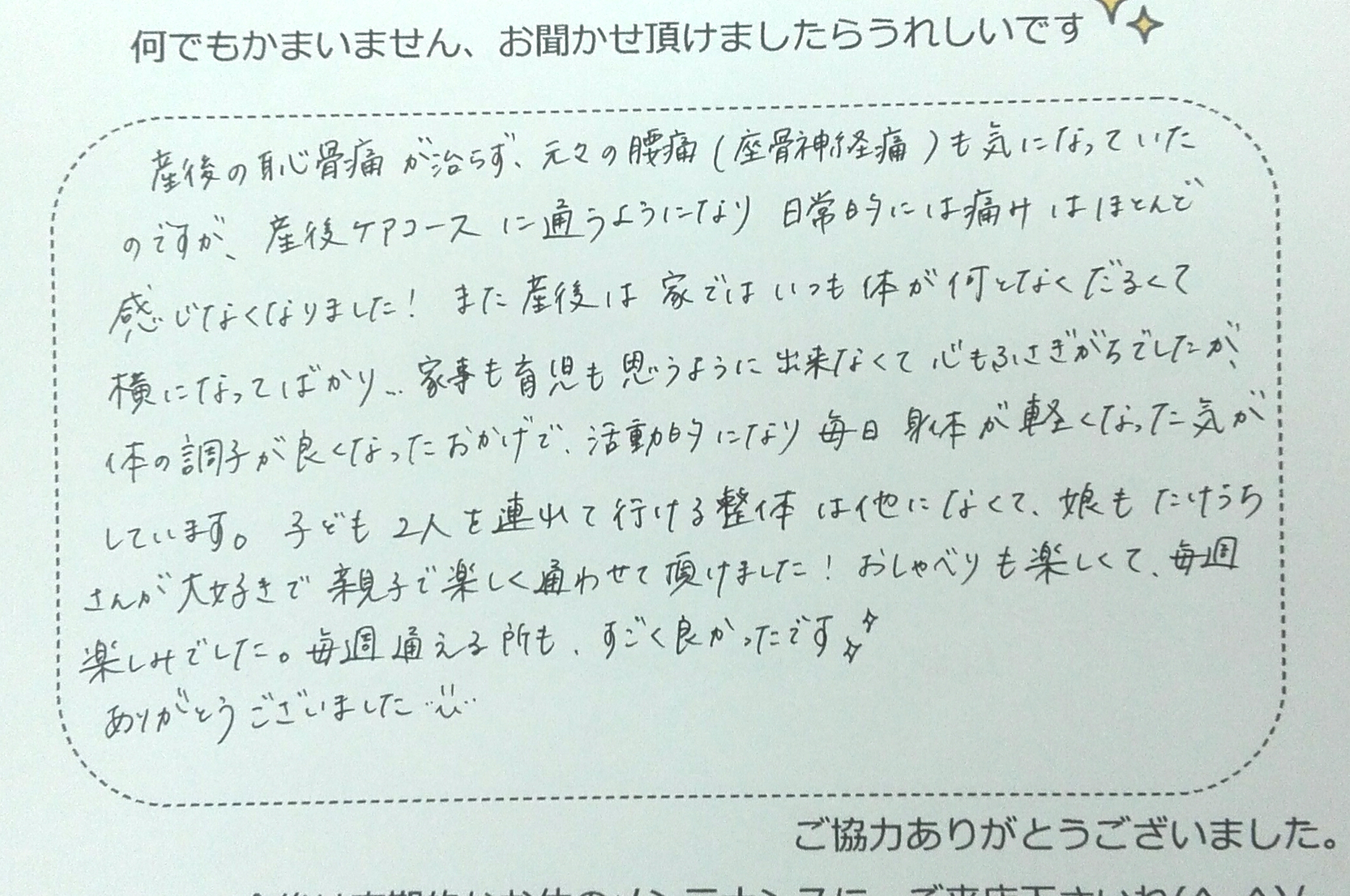 産後の恥骨痛が治らず、元々の腰痛(坐骨神経痛)も気になっていたのですが、産後ケアコースに通うようになり、日常的には痛みはほとんど感じなくなりました!また産後は家ではいつも身体が何となくだるくて横になってばかり、家事も育児も思うように出来なくて、心もふさぎがちでしたが、身体の調子が良くなったおかげで、活動的になり毎日身体が軽くなった気がしています。