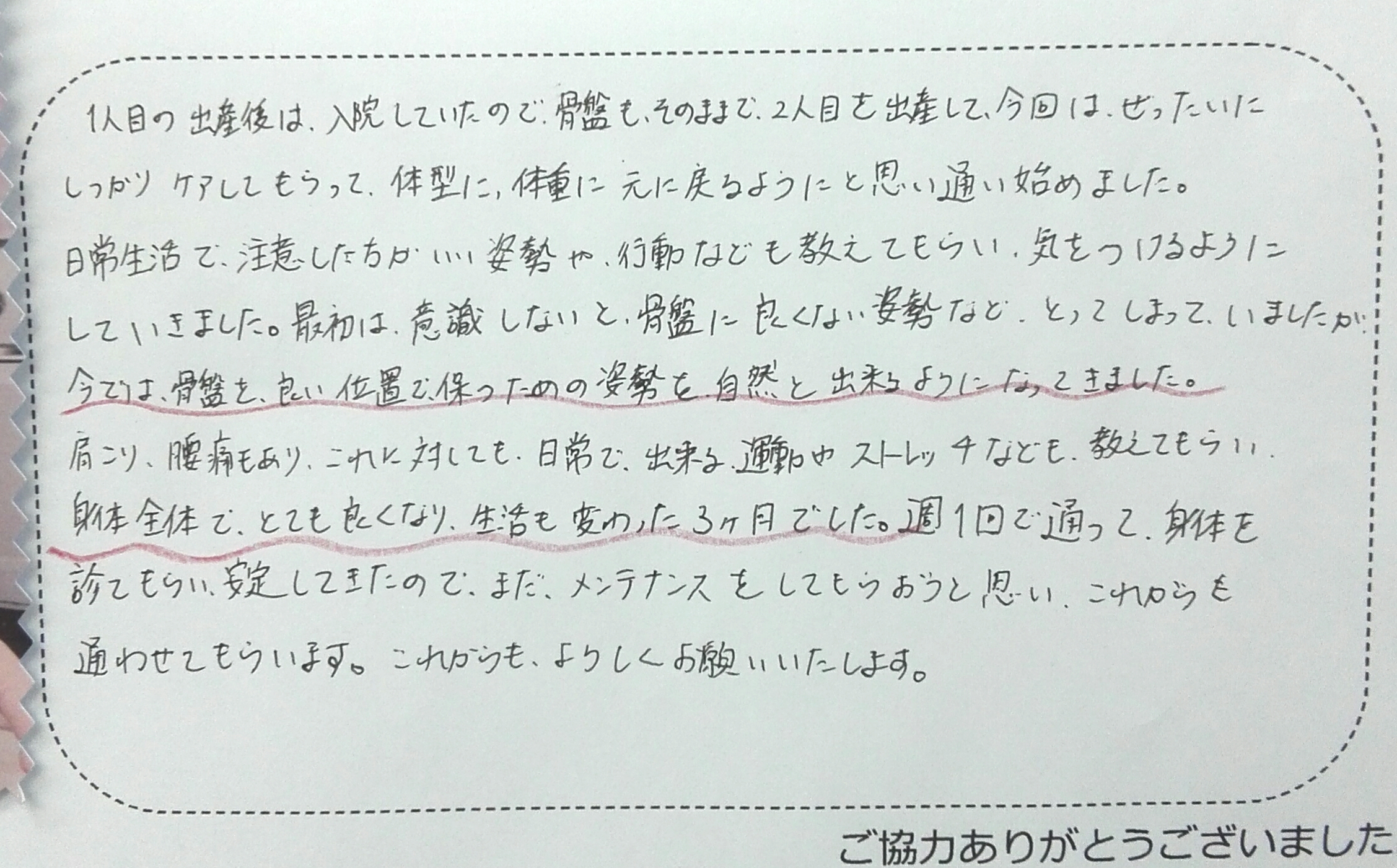 日常生活で、注意した方がいい姿勢や、行動なども教えてもらい、気を付けるようにしていきました。最初は意識しないと、骨盤に良くない姿勢などとってしまっていましたが、今では骨盤を良い位置に保つための姿勢を自然と出来るようになってきました。肩こり、腰痛もあり、これに対しても、日常でできる運動やストレッチなども教えてもらい、身体全体でとても良くなり、生活も変わった3カ月でした。