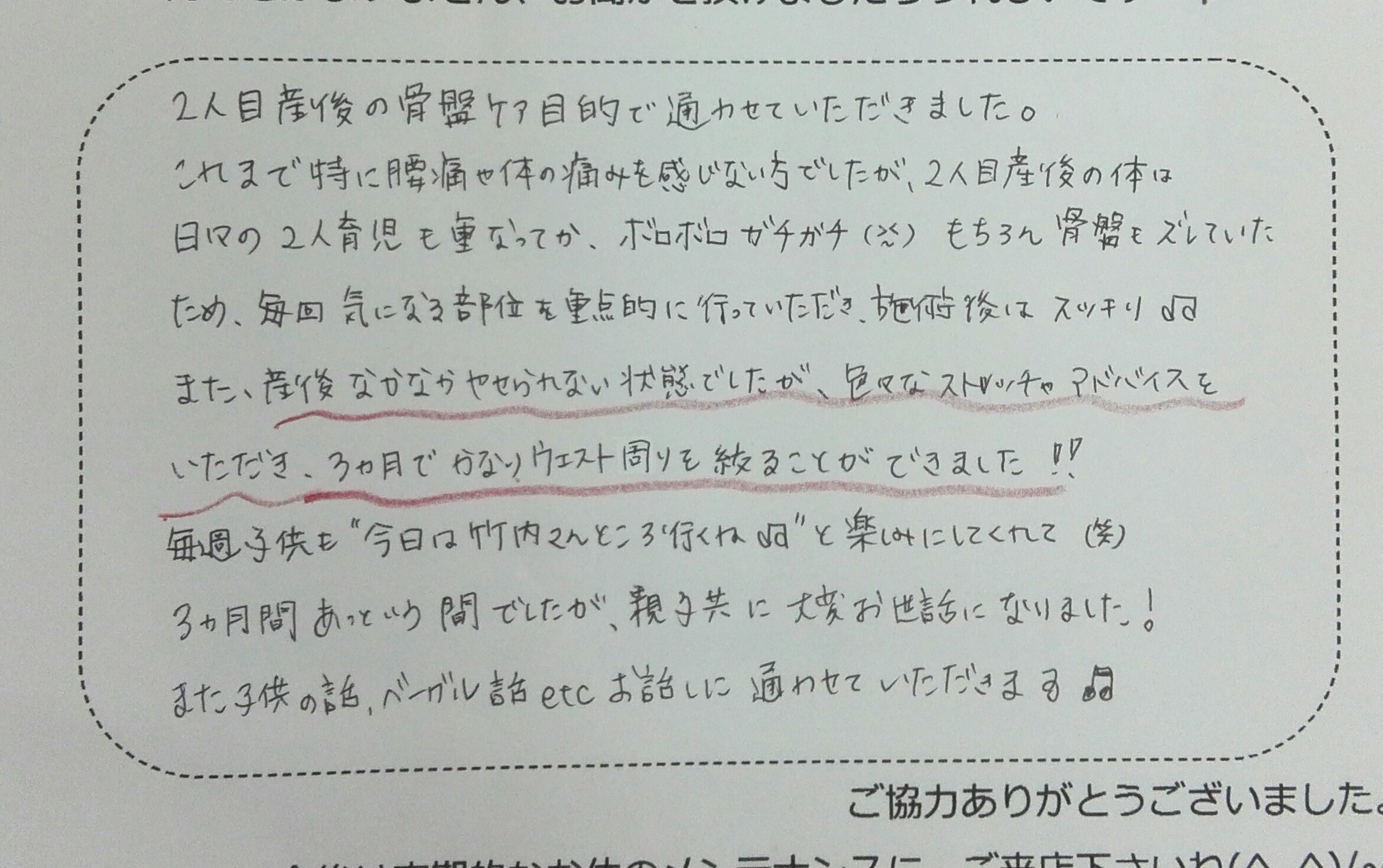 また、産後なかなか痩せられない状態でしたが、色々なストレッチやアドバイスをいただき、3カ月でかなりウエストまわりを絞ることができました!!